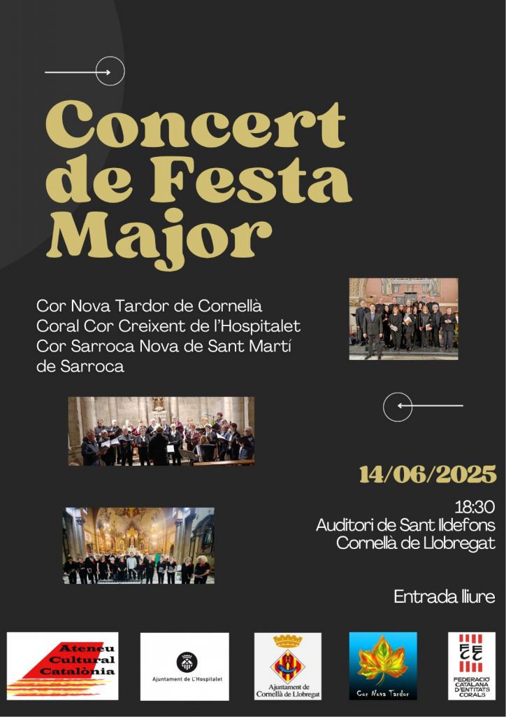 14/06/2025 El Cor Nova Tardor va organitzar i participar en el Concert de Festa Major a l’Auditori de Sant Ildefons de Cornellà, amb dues corals convidades: Coral Cor Creixent, de L’Hospitalet, i Cor Sarroca Nova, de Sant Martí de Sarroca.
